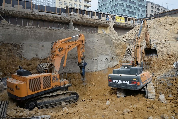 The gigantic work site, once complete, will host the new offices of the Bank of China. Located at the junction of the Boulevard Royal and the Rue Notre Dame, the huge excavator is being used for breaking reinforced concrete foundations with a 7-tonne hydraulic breaker. The first task to complete is a 35-metre-deep, 6-storey underground parking area.